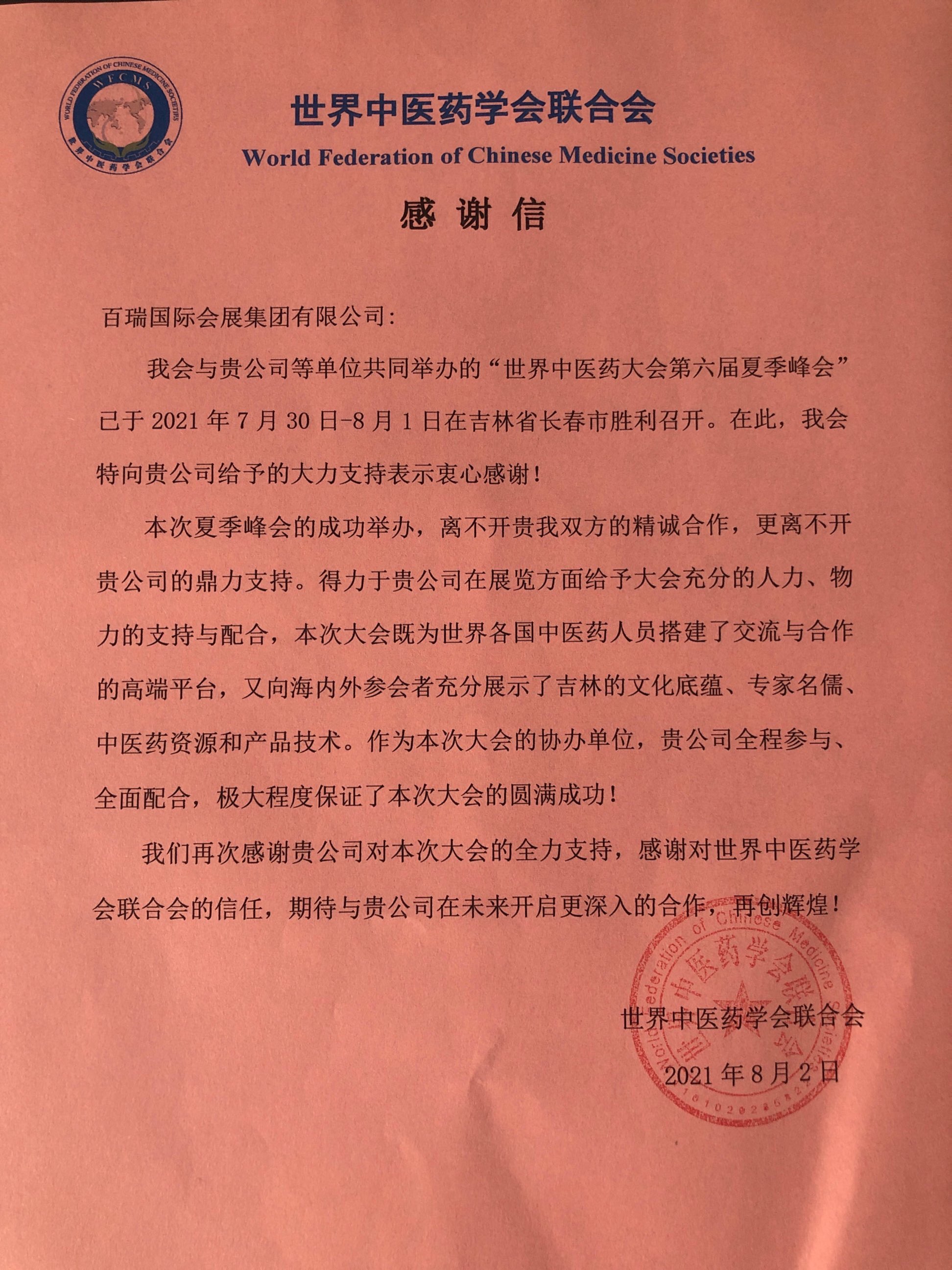 世界中醫(yī)藥學(xué)會(huì)聯(lián)合會(huì)發(fā)來(lái)感謝信