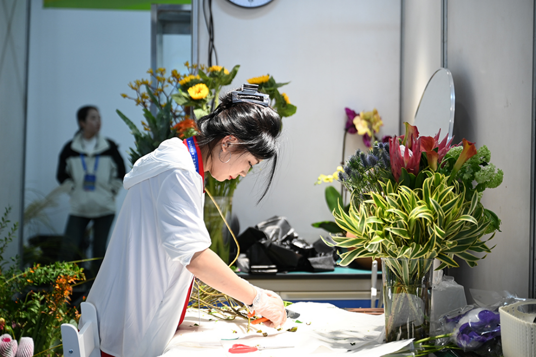 在花藝比賽現場,選手們以花為“媒”,以葉為“伴”,用靈巧的雙手編織出一件件富有藝術感染力的花藝作品;