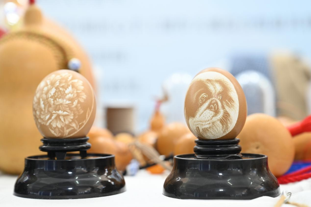 帶著蛋雕“絕技”來到現場的孫維利,正坐在展位前,用她那雙巧手,在脆弱的蛋殼上雕琢著栩栩如生的作品。